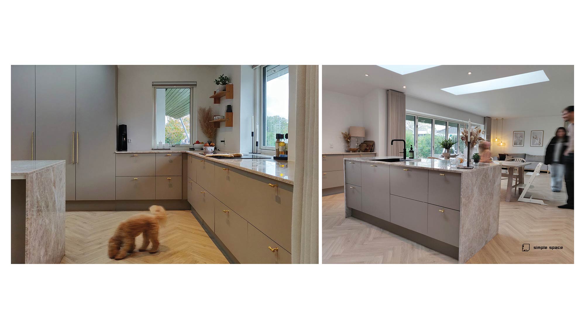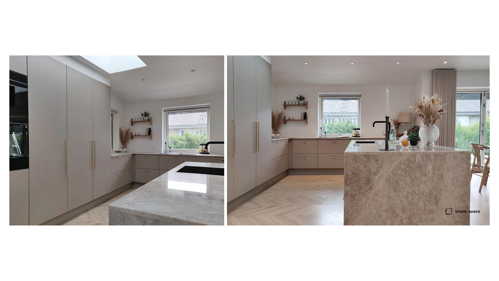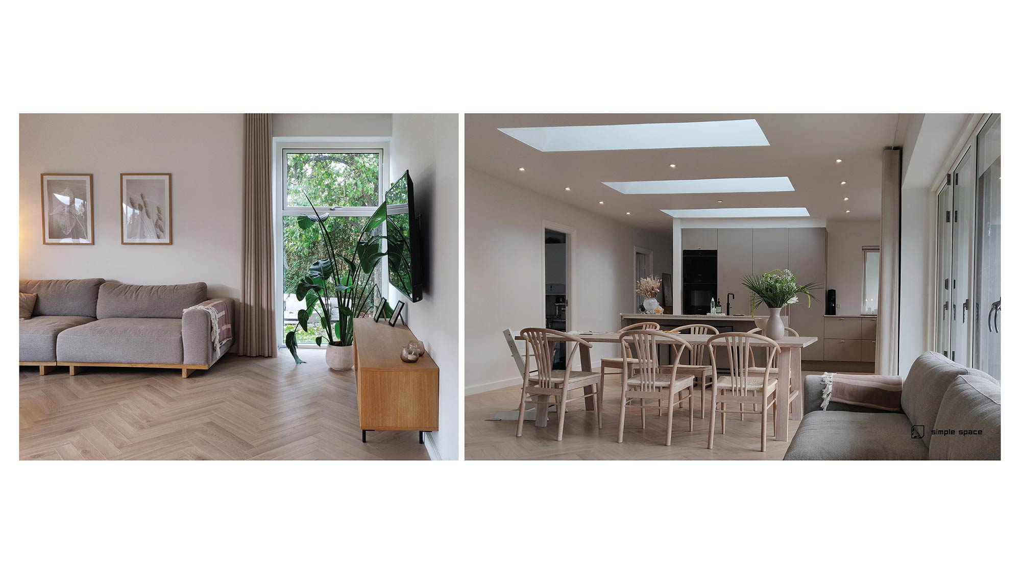 Tilbygningen er indpasset med omtanke for proportioner og materialer. Netpudsede facader, matchende tagudhæng og præcise overgange sikrer, at huset fremstår som én helhed. Den eksisterende del af boligen er samtidig ombygget, så både funktion og rumlighed er opdateret til familiens behov.
